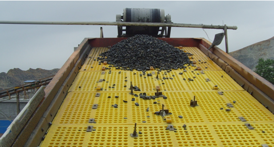 物料进入颚式破碎机前要经过一道振动筛进行预筛分,将小颗粒和粉尘物料筛去,因此要经常清理振动筛以防堵塞,并保证其筛分效果,避免大量粉尘物料进入破碎系统而引起粉尘飞扬。