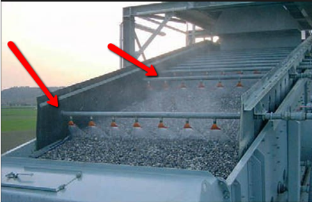 在产生粉尘的入料口、出料口和破碎腔这三个主要部位设置喷水装置,每处各设置两个喷水嘴。其中,入料口处两个喷嘴指向入料口;出料口处两个喷嘴相对形成一定角度,使喷出的雾水成交叉状态,达到最佳喷雾效果,振动筛上喷头装在顶层筛网上方。