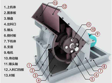 锤式破碎机是靠悬挂在转子上的活动锤头由转子带动转子高速转动用冲击力打击物料,达到破碎的目的。