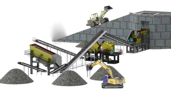 反击式破碎机,二级破碎,可对抗压强度不超过350MPa的各种矿石、岩石(如花岗岩、大理石、石灰石)等物料进行粗、中、细碎作业。