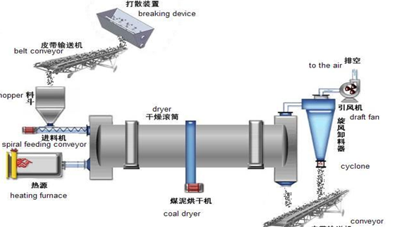 湿物料在筒体内向前移动过程中,直接或间接得到了载热体的给热,使湿物料得以干燥,然后在出料端经皮带机或螺旋输送机送出。在筒体内壁上装有抄板,它的作用是把物料抄起来又撒下,使物料与气流的接触表面增大,以提高干燥速率并促进物料前进。载热体一般分为热空气、烟道气等。载热体经干燥器以后,一般需要旋风除尘器将气体内所带物料捕集下来。如需进一步减少尾气含尘量,还应经过袋式除尘器或湿法除尘器后再放排放。