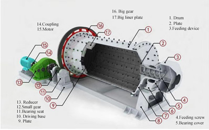 和干式球磨机的外形和部件基本相同,筒体为圆柱形,结构主要包括给料部、出料部、回转部、传动部(减速机,小传动齿轮,电机,电控)等。