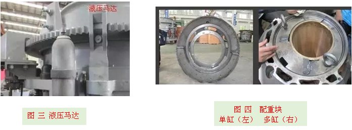 | 排料口调节装置 | 通过油泵对主轴油缸注油或排油,使主轴上移或下移,调节排料口大小。这种调整方式可能引起排矿口在破碎硬矿石时较难锁紧 | 通过液压推手或液压马达,调整调整帽,从而带动调整环在支撑套内旋转(定锥螺旋转动上下移动),达到调整作用。这种调节方式的好处是排矿口容易锁紧。 | 图三 |