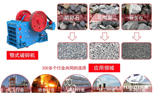 颚式破碎机主要适用于冶金、矿山、化工、建材、公路、铁路、水利等行业,对各种矿石和大块物料的中碎和细碎,用于破碎不同硬度的岩石,例如河卵石,花岗岩,青石,石灰石等。被破碎物料的高抗压强度为2000kg/cm2。